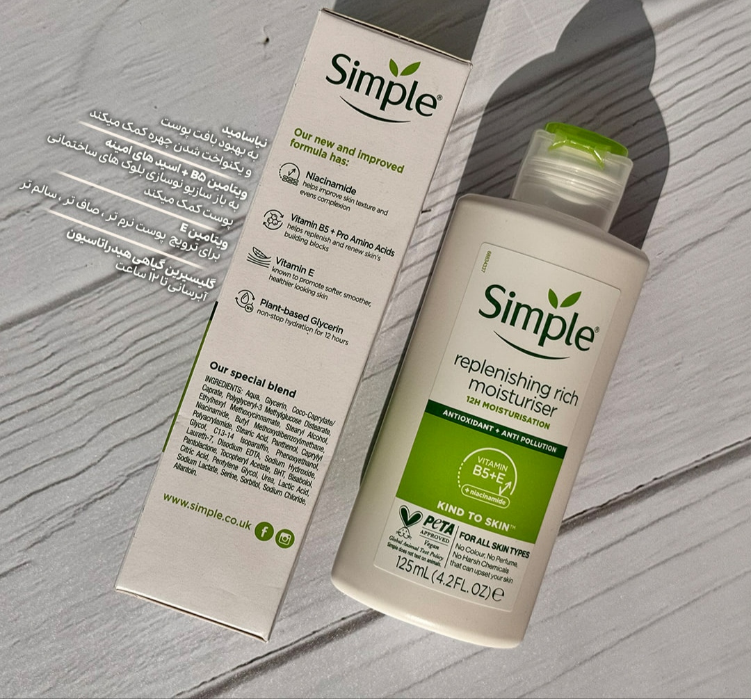 کرم مرطوب کننده سیمپل مدل ریچ از برند مطرح Simple، با بهرهگیری از ترکیبات مغذی همچون پرو ویتامین B5، ویتامین E، گلیسیرین و بیزابولول طراحی شده تا پوست خشک و حساس را به خوبی تغذیه و تقویت کند. این کرم بدون عطر، رنگ و مواد شیمیایی مضر ساخته شده و بنابراین برای انواع پوست، حتی پوست های فوقالعاده حساس نیز مناسب است. ساختار کرمی و غنی آن، بدون ایجاد حس چربی یا چسبندگی، به سرعت جذب پوست می شود و آن را برای مدت طولانی مرطوب و شاداب نگه می دارد. استفاده منظم از این کرم مرطوب کننده سیمپل پوست خشک به کاهش خشکی، خارش و حساسیت های ناشی از کم آبی پوست کمک می کند و سد دفاعی پوست را تقویت می نماید.