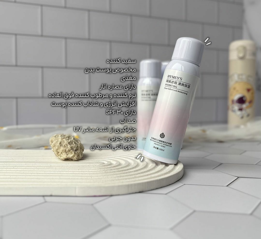 این است که عیب های پوستی را میپوشاند و پوست شما را مرطوب میکند و ضد چین و چروک و از پیری زودرس جلوگیری میکند و ph پوست را کنترل میکند و همه نوع پوستی میتواند از این اسپری جذاب استفاده کنه.